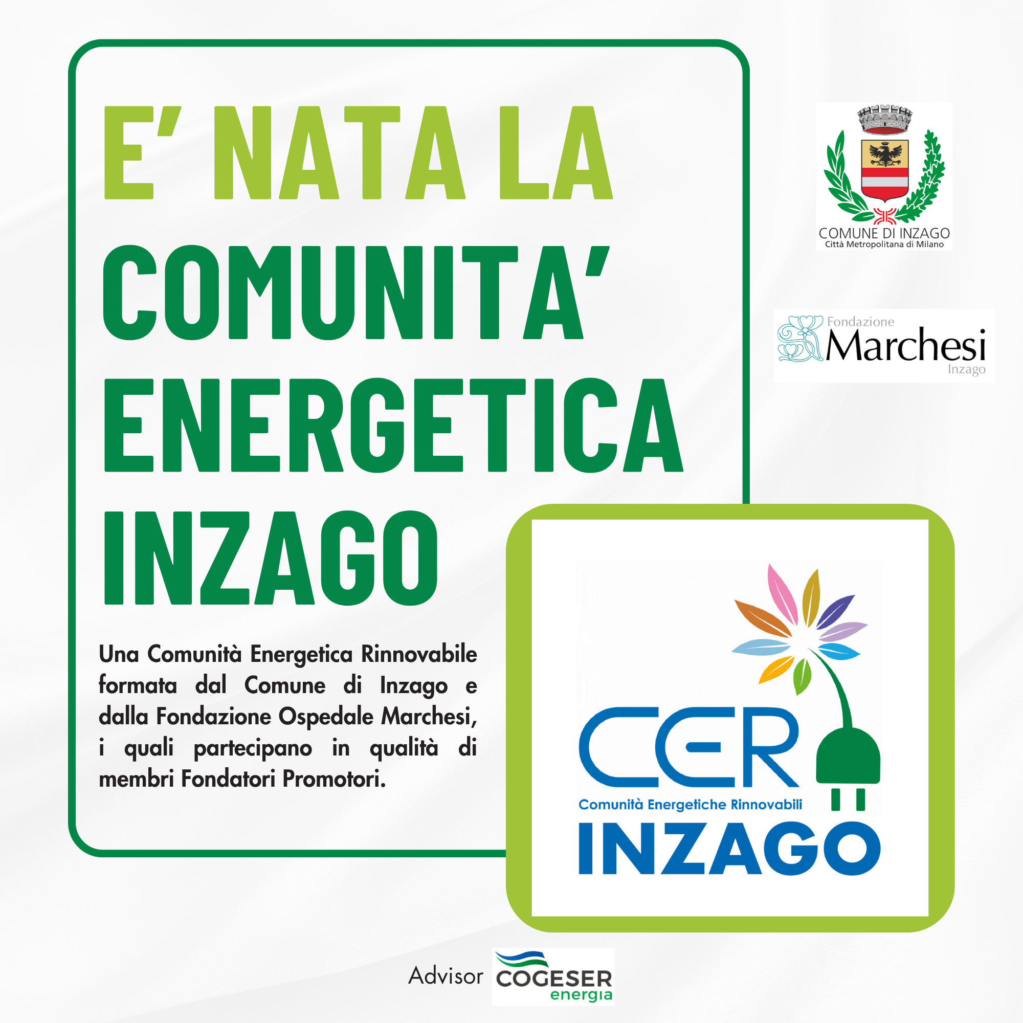 Il Comune di Inzago e la Fondazione Marchesi hanno il piacere di invitarvi a un incontro pubblico per la presentazione della CER Inzago che è stata deliberata il 30.09.2025 nell’ultima seduta di Consiglio Comunale.